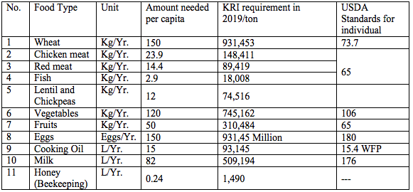 A. Per Capita requirements of food and water: for food self-sufficiency, the basic needs from food for obtaining the needed calories by a normal person under international standards are shown in the following table, along with the needs of the total residents for one year.