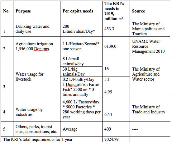 The duration is five years, starting from 2015 and ending in 2019. It is projected that with a 3% annual population growth rate, the population of the KRI will increase from 5,356,531 to 6,209,688 by 2019. The projected food and water needs are based on the estimated population of the KRI in 2019 and take into consideration the calories a human body needs on a daily basis, which is 2,800 to 3,200 calories.