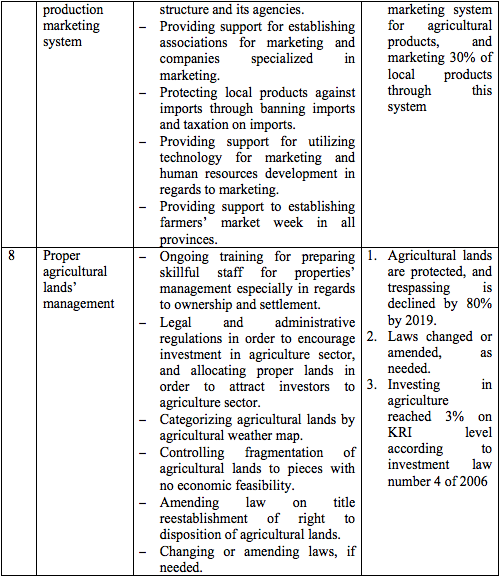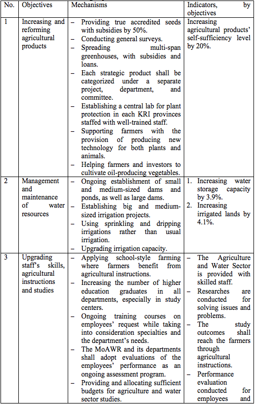 To renovate previous abilities and characteristics it had to put the idea of the strategic plan in 2006 to during the fifth cabin of the Region Government and it has been implementing the five-year plan in 2009 with participation of other sectors such as water resources, trade and food industries. But because of a lack of budget which provided only (9.2%) of the required budget, so it could not implement all goals but we got some joyful results of some products such as wheat and potatoes that can cover more than 100% of region needs and for some other products can cover 54% and some other was below of our requests that does not reach 40%, but conclusion average plan decreased the total local products around 15% and covered 30%-45% local consumption. And from this point of view the ministry of agriculture and water resources of Kurdistan Region suggested the future plan for other five years (2015-2019) but for the reason of financial crisis and ISIS was and the cutoff of regions’ share of the Iraqi budget (17%) by GOI led to the non-implementation of the plan. Actually the financial crisis affected the agricultural sector especially in the farmers’ subsidy from one hand. From the other hand the ministry of agriculture and water resources took this opportunity to take advantage because most people lost their source of income and this gap offset by agricultural activities some people went to agriculture and villages for work and the Agricultural activity and agricultural employment increased from 16% to 20% and also led to increase the products.