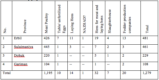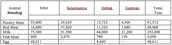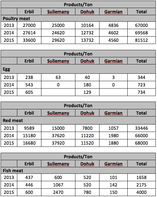 Meat animal production includes poultry, livestock/cattle, and fish. Poultry have a solid infrastructure, for both meat and egg production; however, due to strong competition from imports, the local products cannot prevail. Furthermore, the support provided by the MoAWR was not sufficient, especially in regards to providing fodder, medicine, and vaccines, which eventually affected production. The annual production of chicken meat was only 69,568 tons in 2014 but in 2015 was 81512 tons, which covers 63% of local demand. The production of eggs was 723 Million Eggs in 2014 and 734 Million in 2015, which covers 95% of local demands.
